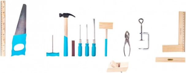 Uključeni su osnovni alati poput pilice, čekića, odvijača, ključa i ravnala u kombinaciji drva i metala s udobnim plavim ručkama. Set je osmišljen za sigurnu i smislenu igru te potiče samostalnost i maštu.