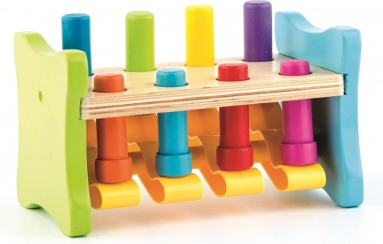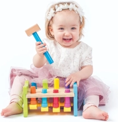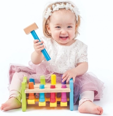 Ova moderna varijanta klasične drvene čekićarke brenda WOODY donosi djeci radost otkrivanja i učenja. Kolčići su povezani plastičnom kolijevkom, pa svaki udarac čekićem ima trenutačan i vidljiv učinak – jedan kolčić se spusti, drugi iskoči gore. Djeca tako kroz igru vježbaju snagu hvata, preciznost i strpljenje.