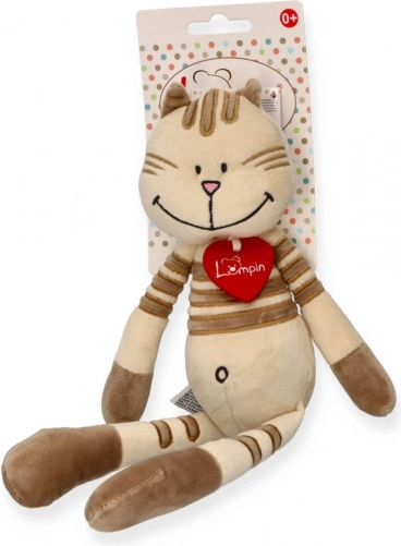 Preslatka plišana mačka s mekanim bež krznom i smeđim prugama savršen je prvi ljubimac za bebe i stariju djecu. Ima duge nožice, širok osmijeh, a oko vrata je krasi filcano srce. Laka je, jednostavna za držanje i sigurna za dob 0+. Radi lakšeg održavanja može se ručno prati na 30 °C.