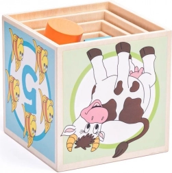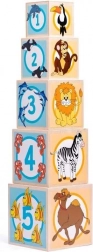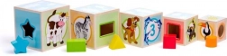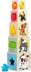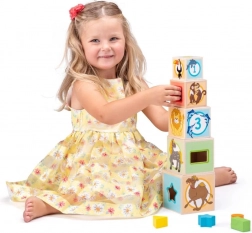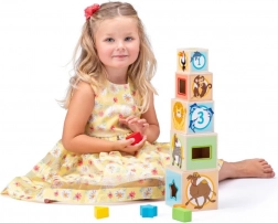 Drveni toranj s čašama i sorterom oblika spaja slaganje u visinu s vježbanjem ubacivanja pravih oblika u odgovarajuće otvore. Djeca razvijaju koordinaciju oko–ruka, uče boje, brojeve i životinje te uživaju u mnogo kreativne igre.