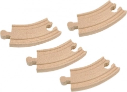 Ovaj set od 4 kratke zakrivljene tračnice odličan je dodatak svakoj drvenoj željezničkoj pruzi. Zahvaljujući duljini od 10 cm po komadu, lako ćete stvoriti kompaktne zavoje, spojnice i novi oblik trase. Tračnice se intuitivno povezuju i prikladne su za male graditelje od 3 godine naviše.