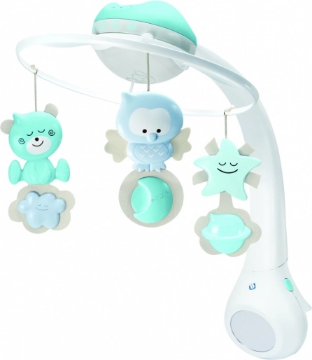 Ova svestrana vrteška raste s vašim djetetom: od novorođenačkog razdoblja kao vrteška s nježnim svjetlom i glazbom (0–5 mjeseci), preko noćne lampice s glazbom za krevetić (6–18 mjeseci), pa sve do samostalne lampice s glazbom na noćnom ormariću (18+ mjeseci). Projektor projicira zvjezdice i stvara mirnu atmosferu za lako uspavljivanje.