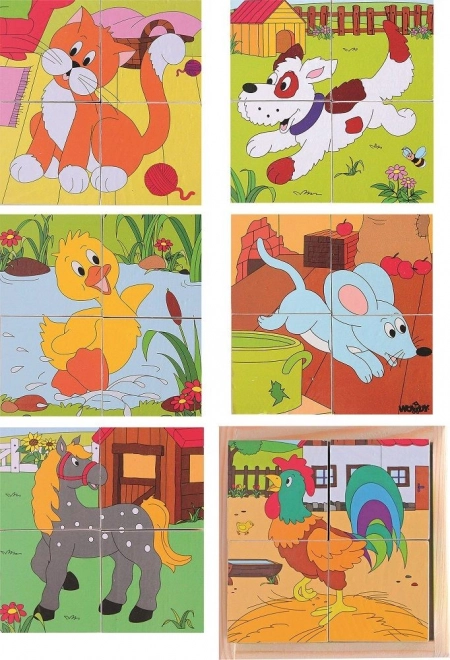 Ovaj set kockastih puzzli donosi djeci radost otkrivanja svijeta sela. Svaka strana kocke čini dio druge slike, pa ćete od 4 kocke lako složiti 6 tematskih ilustracija sa životinjama s farme. Kvalitetna drvena izrada osigurava dug vijek trajanja i sigurnu igru.