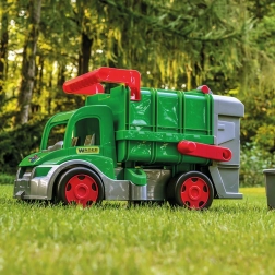 Smetlarski kamion WADER GIGANT FARMER donosi djeci realističnu igru čišćenja grada. Zahvaljujući pokretnom podizaču lako se prazni priloženi kontejner, otvarajuća stražnja klapna olakšava utovar i istovar, a kotači slobodnog okretanja osiguravaju glatko kretanje. Nosivost do 50 kg omogućuje djeci da sjednu na kamion i drže se za praktičnu gornju ručku, dok prednja kuka omogućuje vuču ili povezivanje s drugim vozilom ili užetom.