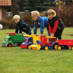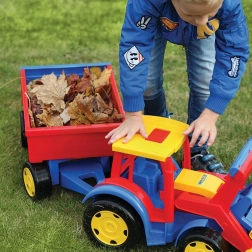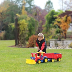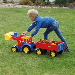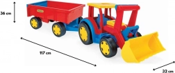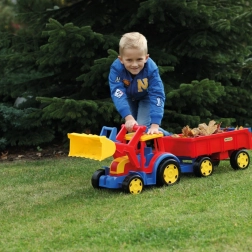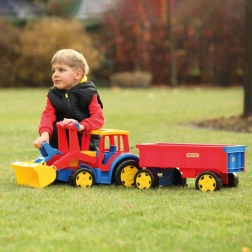 Gigantski traktor s utovarivačem i prikolicom donosi puno realistične zabave pri gradnji, utovaru i prijevozu tereta. Robusna konstrukcija, duga 117 cm, podnosi intenzivnu dječju igru, dok funkcionalna žlica i prikolica s otvarajućom stražnjom klapnom pretvaraju svaku akciju u pješčaniku u pravu avanturu.