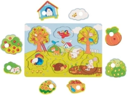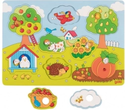Goki drvena slagalica U vrtu je šarena igračka koja je idealna za razvoj motoričkih i kognitivnih sposobnosti djece. Ima osam šarenih dijelova sa slikom u pozadini, koji savršeno pristaju na svoju drvenu podlogu.