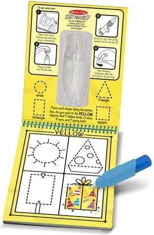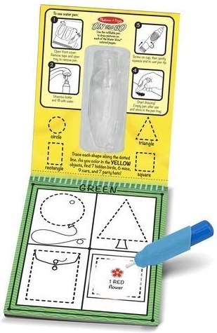 Ova vodena bojanka s naglaskom na oblike donosi djeci zabavno i čisto bojanje. Dovoljno je napuniti priloženu olovku vodom i boje te skriveni detalji čarobno će se pojaviti. Nakon što se stranica osuši, nestanu i zabava može početi ispočetka.