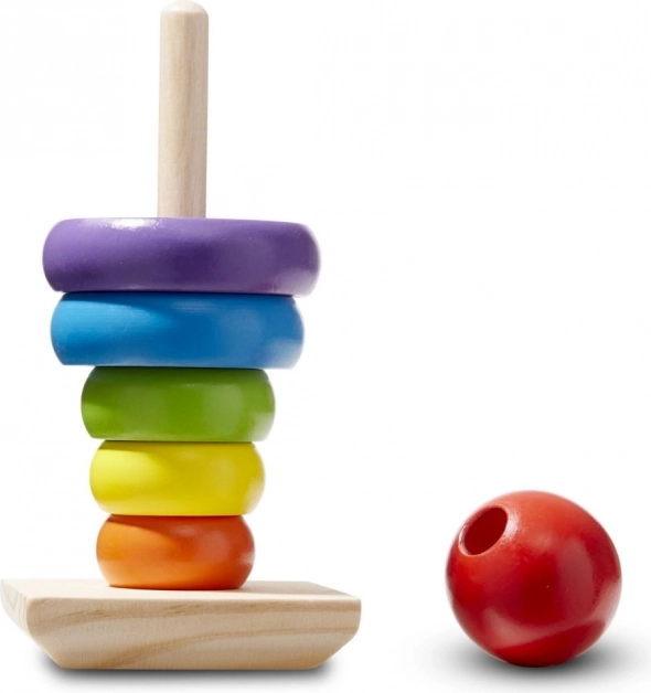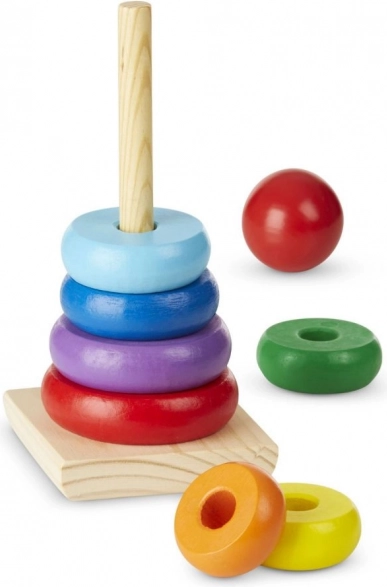 Zabavna i edukativna drvena piramida s raznobojnim prstenovima za razvoj fine motorike i prepoznavanje boja.