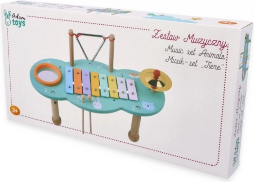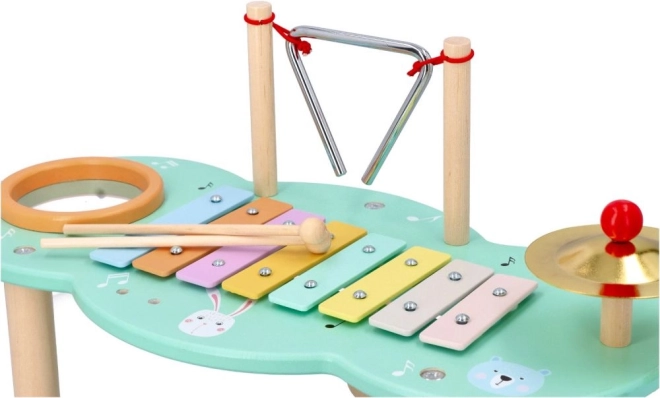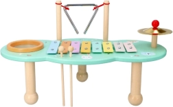 Svi omiljeni udaraljkaški instrumenti na jednom mjestu: ksilofon, triangl i činel na čvrstoj drvenoj konstrukciji s ilustriranom pločom i nogama za sigurnu svirku.