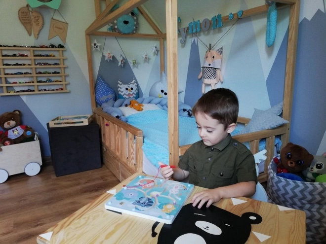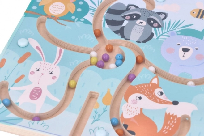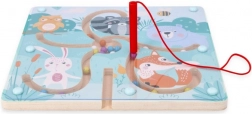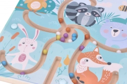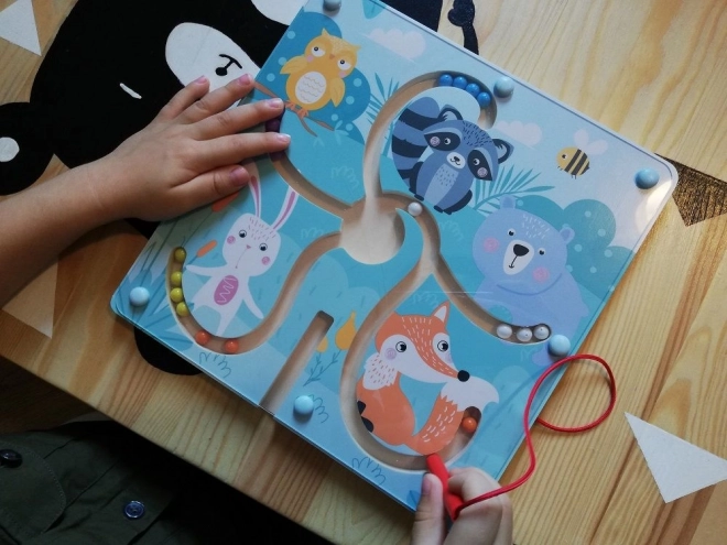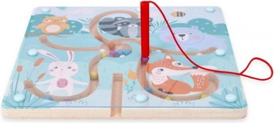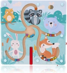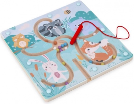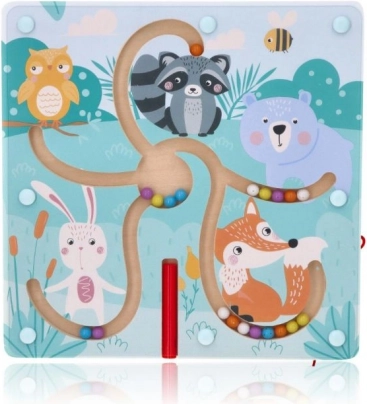 Drveni magnetični labirint s motivom šumskih životinja oduševit će male istraživače već od 2 godine. Pomoću magnetne olovke djeca će pomicali šarene kuglice po stazama, vježbati finu motoriku, koordinaciju oko–ruka i logičko razmišljanje. Kuglice štiti prozirni pokrov, olovka je na uzici, a kompaktne dimenzije 22,5 × 22,5 cm čine ga idealnom igračkom za putovanja. Certifikacija CE.
