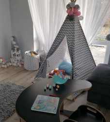 Čvrsti drveni dijelovi s glatkim rubovima, CE certifikat i nježna paleta boja osiguravaju sigurnu i estetsku igru koja podnosi svakodnevno korištenje.
