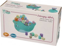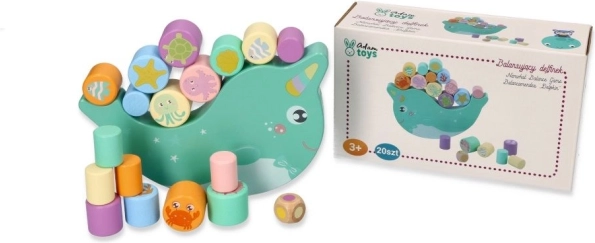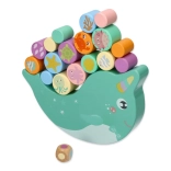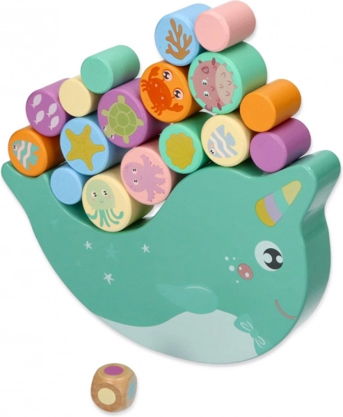 Otkrijte zabavnu drvenu balansirajuću igru s narvalom u kojoj djeca balansiraju šarene valjčiće s motivima morskih životinjica na njihajućoj bazi. Cilj je zadržati ravnotežu i slagati dijelove tako da se narval ne prevrne – odlična igra za trening fine motorike, koordinacije oko–ruka i strpljenja.