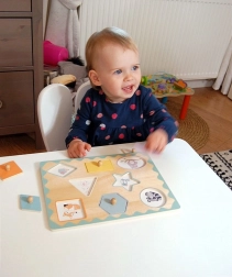 Ova smisleno osmišljena igračka potiče koncentraciju, logičko razmišljanje i koordinaciju pokreta. Djeca prirodno vježbaju imenovanje oblika i boja, uvježbavaju pravilan hvat te stječu sigurnost pri rukovanju manjim predmetima.