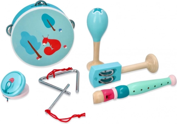 Tamburina s motivom lisice/vjeverice, maracas, triangl, harmonika i drugi instrumenti u ugodnim mentol bojama potiču osjećaj za ritam i koordinaciju ruku.