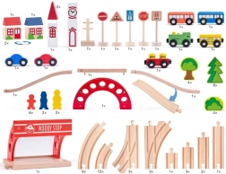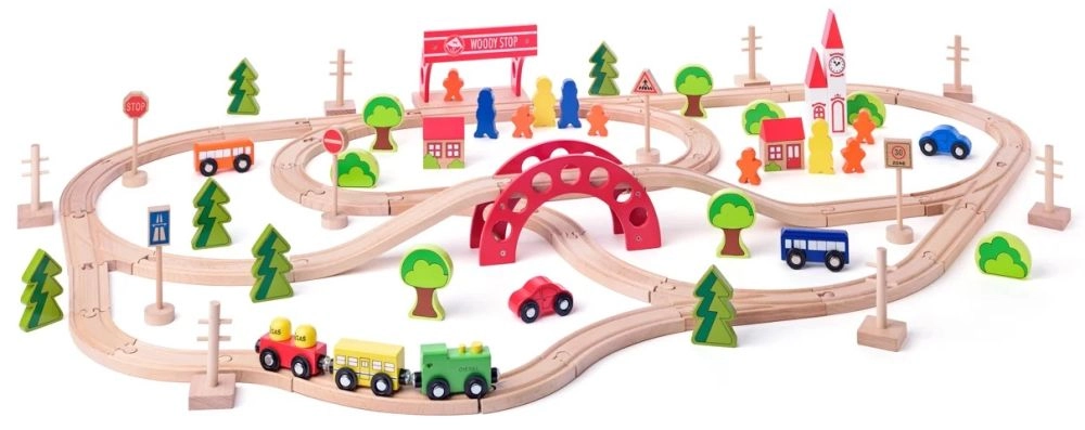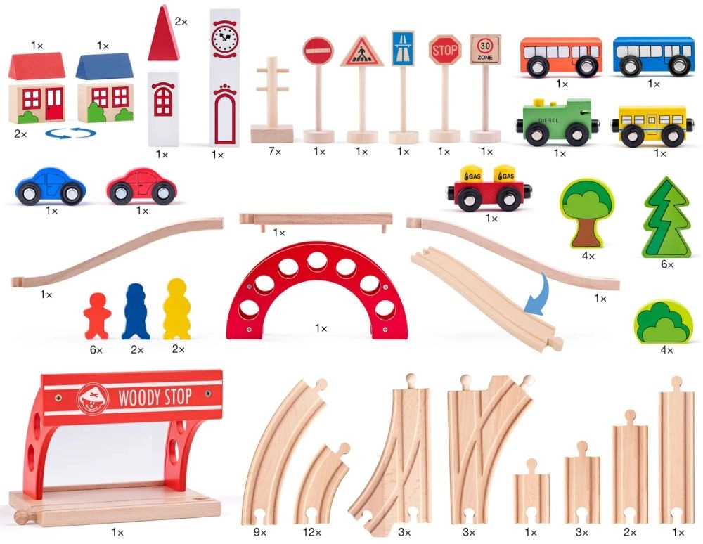 Drvena željeznička pruga s mostom nudi puno zabave i potiče suradnju među djecom. Sadrži mnogo raznolikih dijelova koje djeca moraju sastaviti, što donosi dodatnu zabavu.