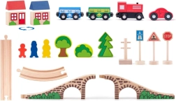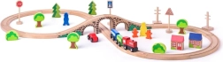 Drvena željeznica osmica s mostom više je od obične igračke. To je idealno sredstvo za razvoj dječje mašte i motoričkih vještina. Ovaj set sadrži šarene vlakove, stabla, kućice i prometne znakove koji stvaraju realističan prostor za igru.