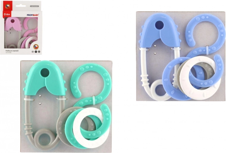 Slatki set zvečkica za najmlađe u pastelnim bojama kombinira oblik sigurnosne igle i osmice. Podupire razvoj osjetila, vježba refleks hvatanja te je izrađen bez oštrih rubova i sitnih odvojivih dijelova.