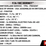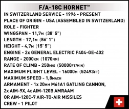 Uronite u svijet zrakoplovstva s modelom F/A-18C Hornet u mjerilu 1:48, sastavljenim od 540 kockica. Ovaj model je vjerna kopija švicarskog lovca s kvalitetnim otiscima i brojnim pokretnim dijelovima, uključujući sklopivi stajni trap i okretne kotače. Osim toga, nudi i naoružanje pod krilima te posebnu kockicu za smještaj pilota u kokpitu.
