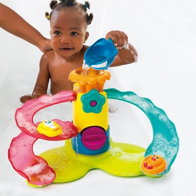 Pretvorite obično kupanje u avanturu s našim šarenim plastičnim akvaparkom! Ova igračka nudi dvije spiralne vodene tobogane povezane s centralnom kulom s plavim cvjetnim gumbom i hobotnicom na vrhu, što potiče osjetilnu i maštovitu igru. Djeca će uživati u satima zabave u kupaonici s ovom igračkom, koja potiče kretanje i stimulaciju boja. Uključuje dvije životinje na splavima i zdjelu u obliku kita za točenje vode.