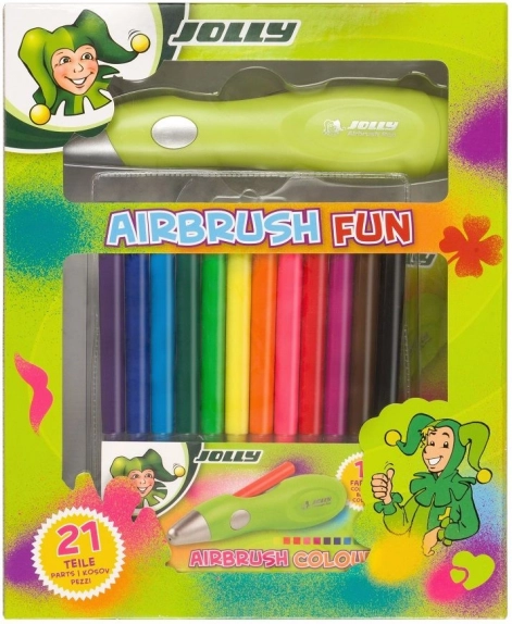 Airbrush olovka JOLLY pretvara svaki papir, karton ili tekstil u originalno djelo. Zahvaljujući elektroničkom raspršivanju boje postižite glatke prijelaze, sjenčanje i precizne linije bez napora. Zabavne šablone sa slovima, brojkama i motivima olakšavaju početke i potiču dječju maštu.