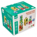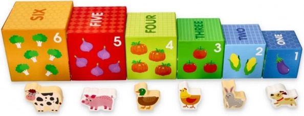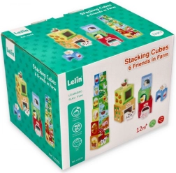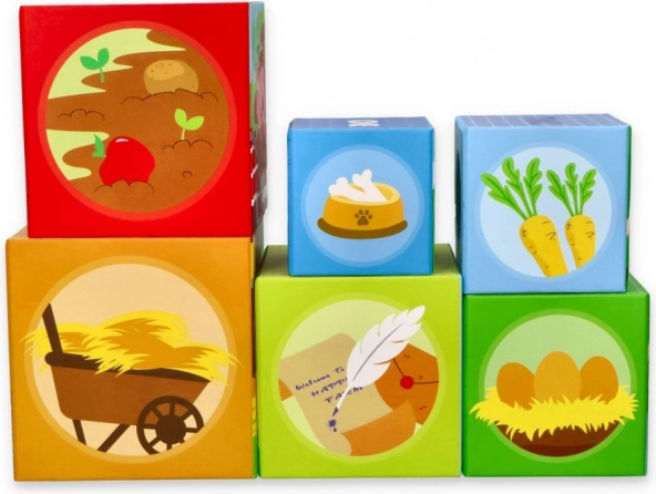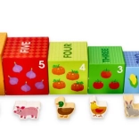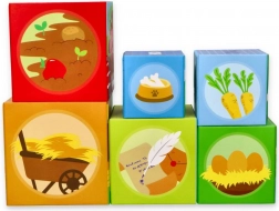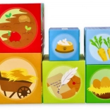 Ovaj šareni set slagalica kocaka s motivima farme nudi djeci beskrajne mogućnosti igre: od gradnje visoke kule, preko umetanja i razvrstavanja, do otkrivanja brojeva, plodova i simpatičnih životinjica. Svaka je kocka ilustrirana tako da potiče vizualnu percepciju, prepoznavanje oblika i količina te prvo brojanje.
