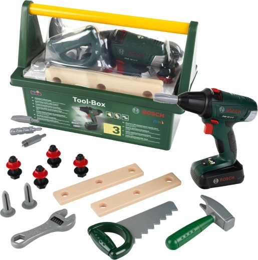 Ovaj kvalitetan dječji set nastao je u licenci BOSCH i dizajniran je tako da vjerno oponaša pravi alat, a pritom je u potpunosti siguran za djecu. Robusna, tamnozelena kutija za alat s udobnom žutom ručkom drži sve dijelove uredno na okupu i olakšava prenošenje.