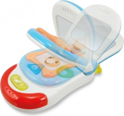 Nasmijani telefon je aktivna igračka koja će djecu zabaviti na dugo vrijeme. Zahvaljujući pokretnom poklopcu, veselim melodijama i treperećim svjetlima razvijaju sluh, vid i finu motoriku. Nakon otvaranja poklopca pojavljuje se sigurno zrcalce za zabavno grimase i otkrivanje vlastitog odraza.
