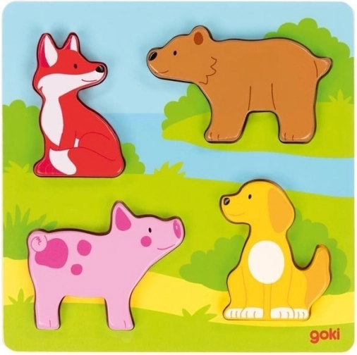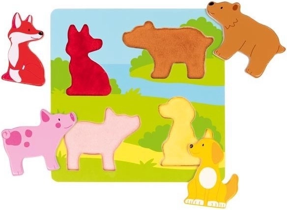 Ova kvalitetna drvena slagalica s četiri životinje (lisica, psić, medvjed, prasić) skriva ispod izrezanih otvora taktilne površine koje oponašaju njihovo krzno ili kožu. Djeca tako tijekom igre uključuju vid i dodir te bolje povezuju oblike, boje i osjetilnu percepciju.