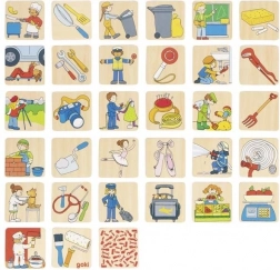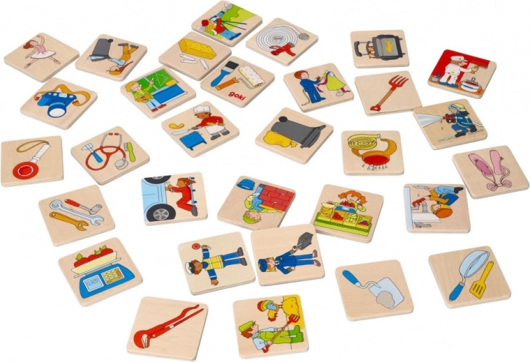 Drveno memory Zanimanja od GOKI donosi djeci i odraslima pametnu zabavu koja razvija koncentraciju, logičko razmišljanje i komunikaciju. Svaki par prikazuje zanimanje i pripadajući predmet – djeca se tako prirodno uče prepoznavati različite profesije i njihove alate.