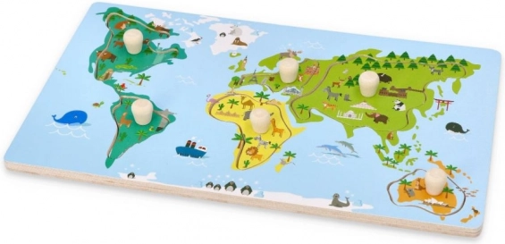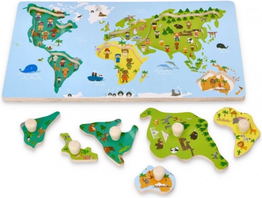 Puzzle prikazuje kontinente s izraženim bojama i nacrtanim životinjama i znamenitostima, što djeci olakšava učenje i čini geografiju zabavnom.