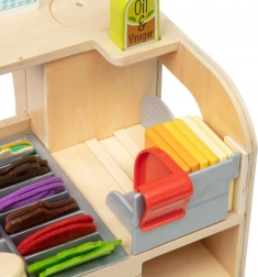 Ovaj realistični pult za sendviče omogućuje djeci slaganje vlastitih kombinacija peciva, sireva, povrća i umaka. Drveni i filcani dijelovi ugodni su na dodir i izdržljivi, pa igra traje svaki dan. U kompletu je i pregledno razvrstavanje sastojaka te jednostavne slikovne upute koje vode djecu korak po korak.