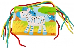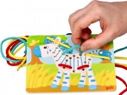 Šarena drvena zebra s otvorima za vezice, idealna za učenje koordinacije ruku i oka.