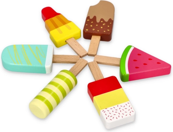 Šest originalnih drvenih sladoleda s različitim oblicima i uzorcima potiče maštovitu igru i vježba imaginaciju.