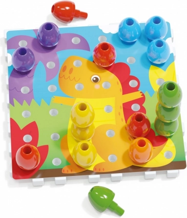 Kreativni građevni set Jumbo Peggy omogućuje djeci korištenje obojenih kolčića, podloga i kotača za izradu vlastitih vozila. Komponente su posebno dizajnirane za malu djecu.