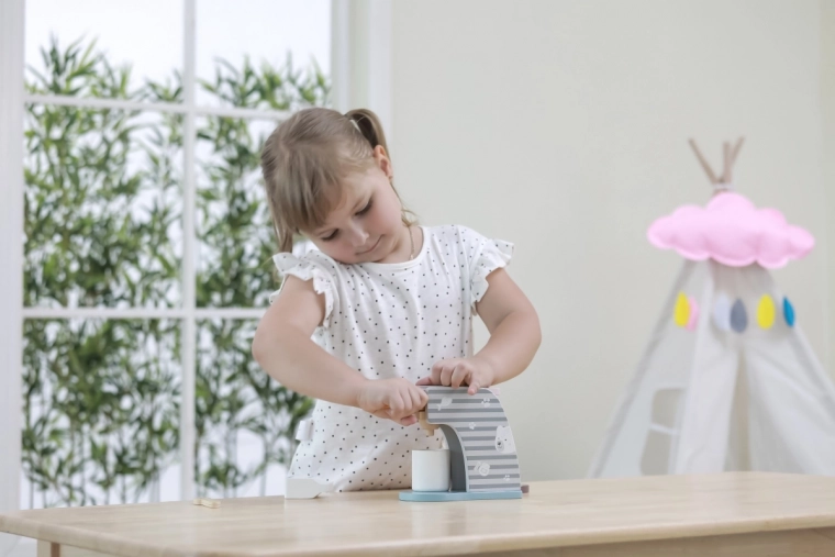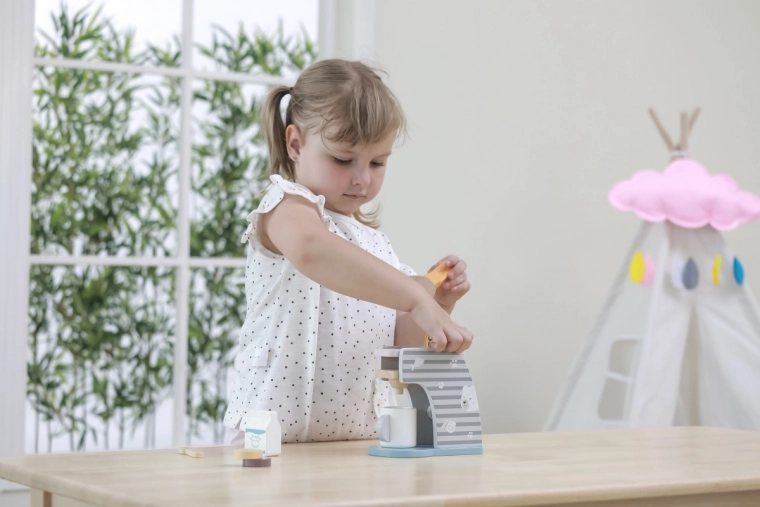 Stilski drveni aparat za kavu za djecu od 3 godine donosi realističnu pripremu kave u svaku dječju kuhinju. Zahvaljujući okretnom regulatoru, ručnom držaču i priloženim dodacima (šalica, žličica, kapsule i „mlijeko“) razvija finu motoriku, maštu i igranje uloga. Kompaktne dimenzije i kvalitetno lakirano drvo osiguravaju sigurnu i izdržljivu igru svaki dan.