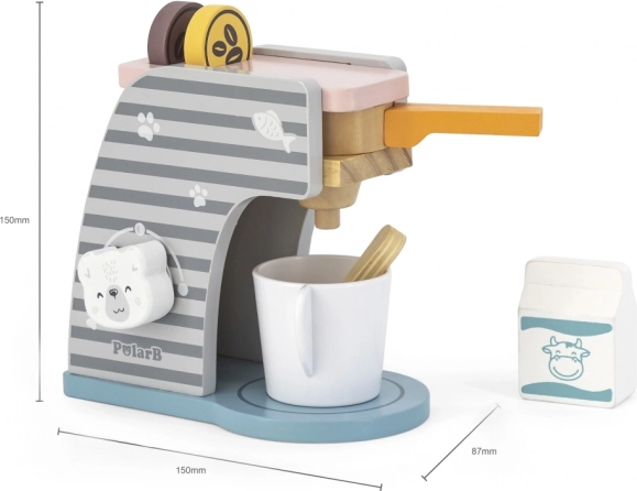 Ovaj drveni dječji aparat za kavu u nježnim bojama s preslatkim motivima osmišljen je za male bariste. Okretni elementi i ručni sustav oponašaju pravi aparat za kavu, pa djeca mogu „napraviti” espresso, dodati „mlijeko” i promiješati žličicom u bijeloj šalici.