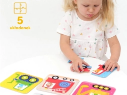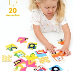Otkrijte prve slagalice za najmlađe! Set sadrži 5 šarenih slagalica od po 4 dijela s simpatičnim vozačima i vozilima. Čvrsti dijelovi savršeno pristaju malim ručicama, potiču finu motoriku, pažnju te učenje boja i naziva. Posebnost je mogućnost mijenjanja dijelova između slagalica kako biste stvarali vlastite kombinacije.