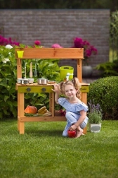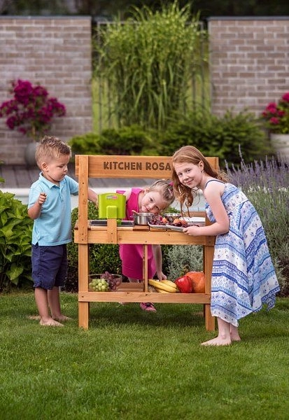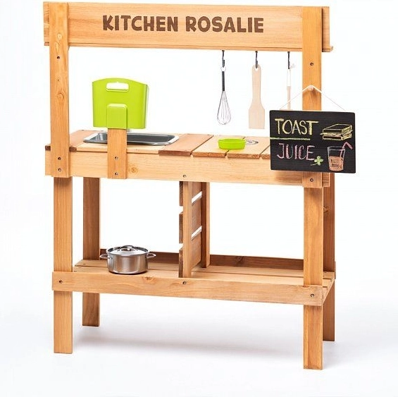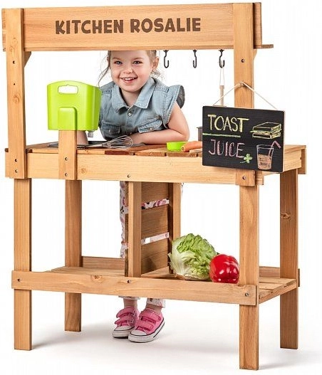 Drvena kuhinjica Rosalie djeci donosi realističan prostor za igru kuhanja – od miješanja i pranja u plastičnom sudoperu do posluživanja na radnoj plohi. Izdržljiva kombinacija drva i plastike pogodna je za vanjsku upotrebu, dok kukice i police drže svo posuđe i sastojke pregledno nadohvat ruke.