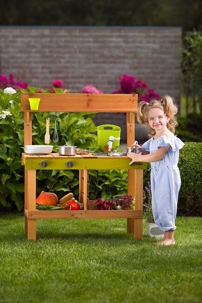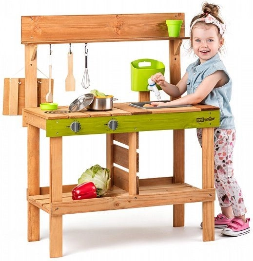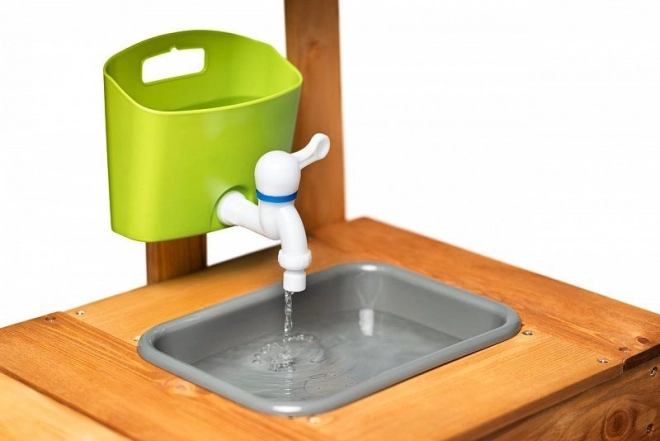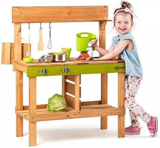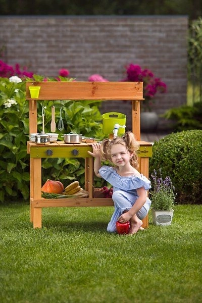 Zahvaljujući izraženim zelenim detaljima, kuhinjica se lijepo uklapa u vrt i potiče osjetilnu igru s vodom, zemljom i lišćem. Idealna je za djecu od 3 godine i pomaže razvijati maštu, igru uloga i društvene vještine.