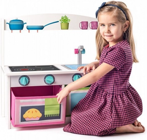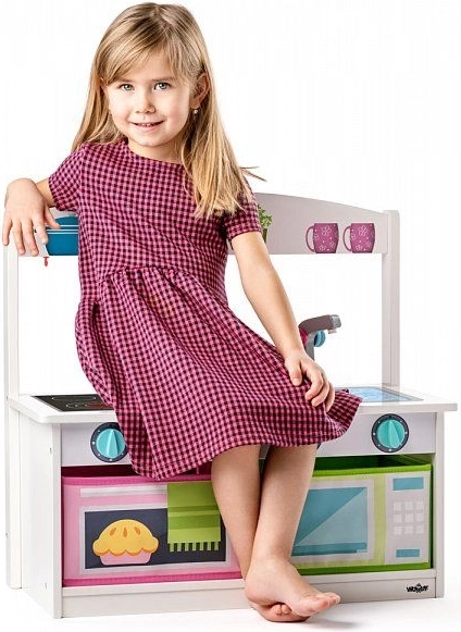 Ova multifunkcionalna drvena kuhinjica i klupica 2-u-1 nudi djeci sate zabave i praktičnu uporabu u jednom. Kuhinjica je opremljena kuhalom s okretnim gumbima, sudoperom sa slavinom i spremišnim pretincima koji podsjećaju na pećnicu i mikrovalnu. Zahvaljujući stabilnoj konstrukciji pogodna je za svakodnevnu igru i sjedenje.
