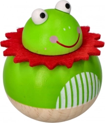 Razigrana žabica se nikada ne prevrne – ma postavili je na glavu, gurnuli ili zavrtjeli, uvijek će se s osmijehom vratiti u uspravan položaj. Ovaj jednostavan, ali privlačan mehanizam potiče koordinaciju oko–ruka, vježba finu motoriku i prirodno razvija dječju znatiželju.