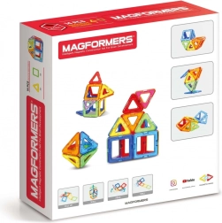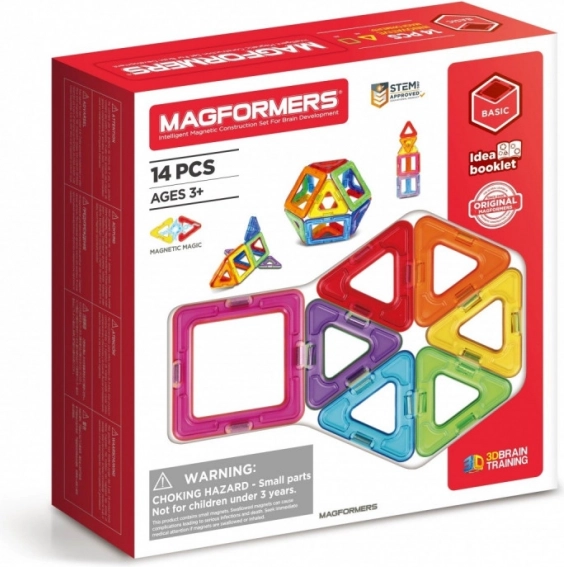 MAGFORMERS BASIC 14 su blokovi s ugrađenim snažnim neodimijskim magnetima koji se međusobno uvijek privlače. Dovoljno je približiti stranice dvaju blokova i oni će se odmah spojiti. Od kockica oblikovanih prema geometrijskim oblicima možete graditi prekrasne trodimenzionalne građevine. Tijekom igre možete koristiti priložene upute ili druge primjere na stranicama magformersworld.com, kao i vlastitu maštu. Set sadrži: 8 trokuta; 6 kvadrata.
