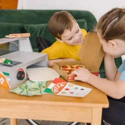 Uključuje drvenu pizzu, razne priloge i igraći novac, što omogućuje djeci da iskuse cijeli proces pripreme i prodaje pizze.