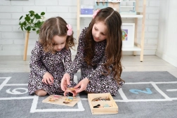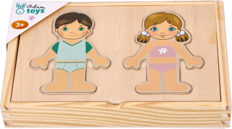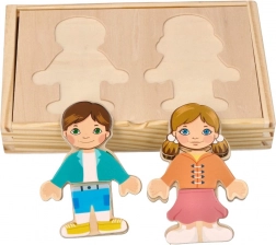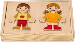Ova drvena magnetska slagalica s figuricama dječaka i djevojčice nudi deseci mogućnosti kako ih odjenuti i kombinirati pojedine dijelove. Djeca tijekom igre vježbaju koordinaciju oko–ruka, logičko razmišljanje i percepciju oblika i boja.