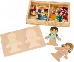 - Figurice dječaka i djevojčice s izmjenjivim magnetskim dijelovima odjeće, drvena kutija/podloga