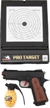 Zabavni dječji pištolj na kuglice 6 mm s metom za vježbanje preciznosti za male strijelce. Izdržljivo plastično kućište, jednostavno rukovanje i puno akcijske zabave u igri policajci i lopovi. Prikladno od 3 godine.