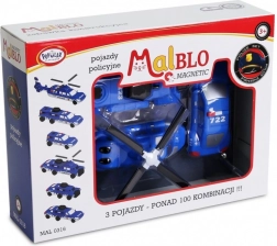 Otkrijte svijet akcije s policijskom serijom MalBlo MAGNETIC. Zahvaljujući pametnoj magnetskoj i klik vezi, djeca lako povezuju module i stvaraju helikopter, automobil ili specijalno interventno vozilo – u trenu. Set sadrži 9 dijelova (3 gotova vozila) koje je moguće po želji kombinirati u desetke originalnih varijanti.