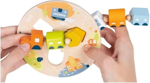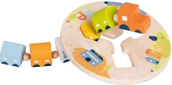 Ovaj kvalitetni drveni vlakić marke GOKI osmišljen je kao domišljata vještinska igra za razvoj dječjih sposobnosti. Lokomotiva s pet različito oblikovanih vagona prolazi kroz provlačnu bazu i nastavlja dalje samo kada su vagoni postavljeni na pravo mjesto. Djeca se tako prirodno uče logici i koordinaciji oko–ruka.