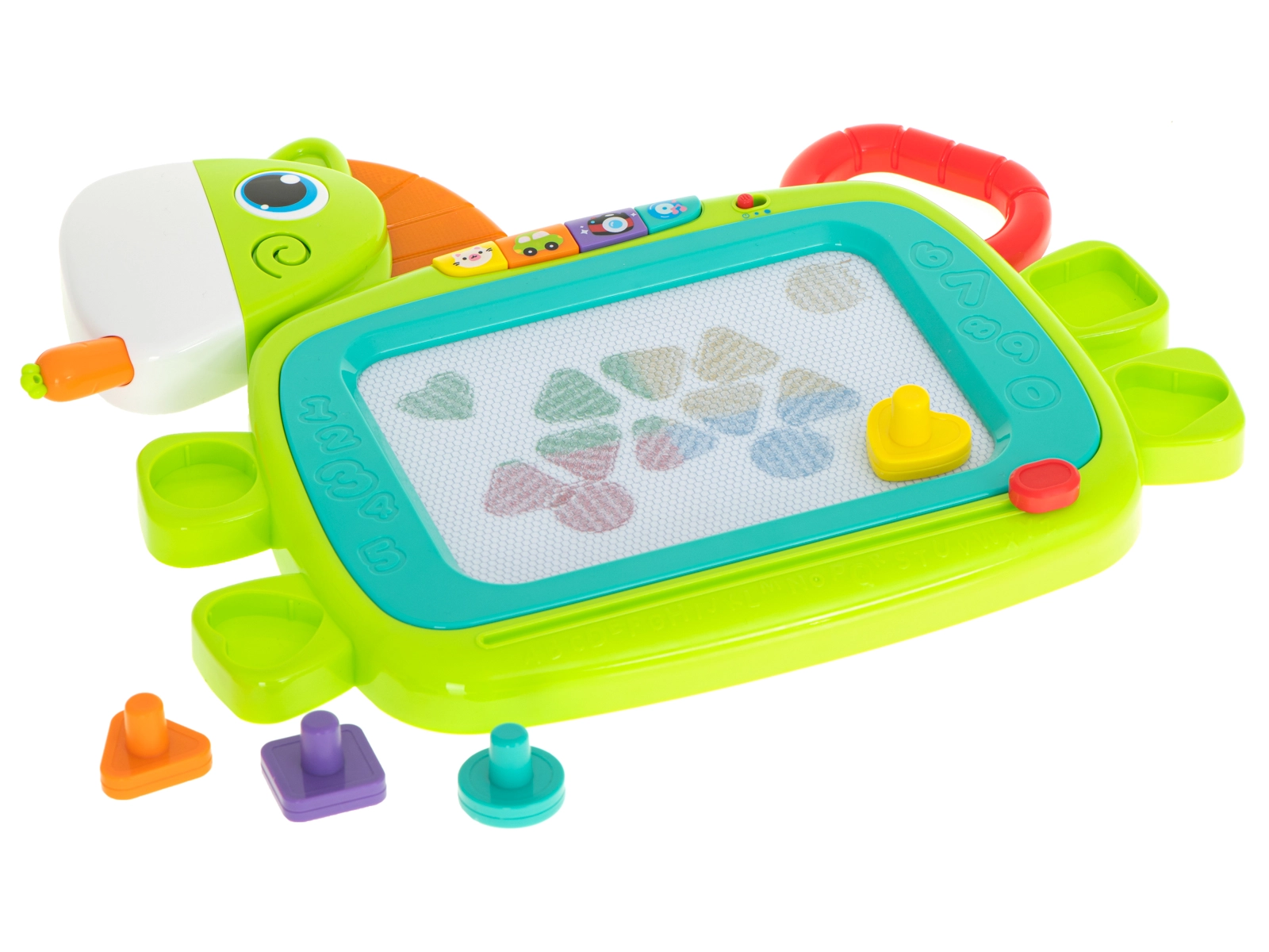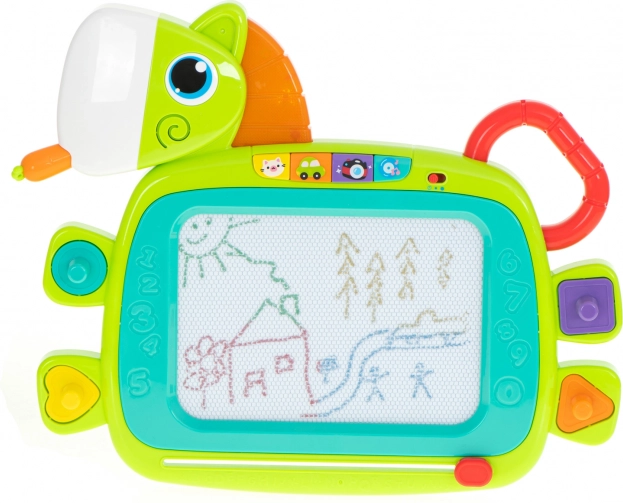 Interaktivni elementi donose zvukove životinja, zvukove prijevoznih sredstava, zvukove iz kućanstva i vesele melodije. Igračka ima 2 razine glasnoće i mogućnost potpunog isključivanja zvuka. Olovka u obliku mrkve pri umetanjу u „usta” konjića proizvodi efekt krckanja. Rubove ploče krase izbočena slova i brojke – idealno za prvo upoznavanje s oblicima.