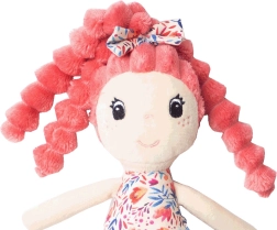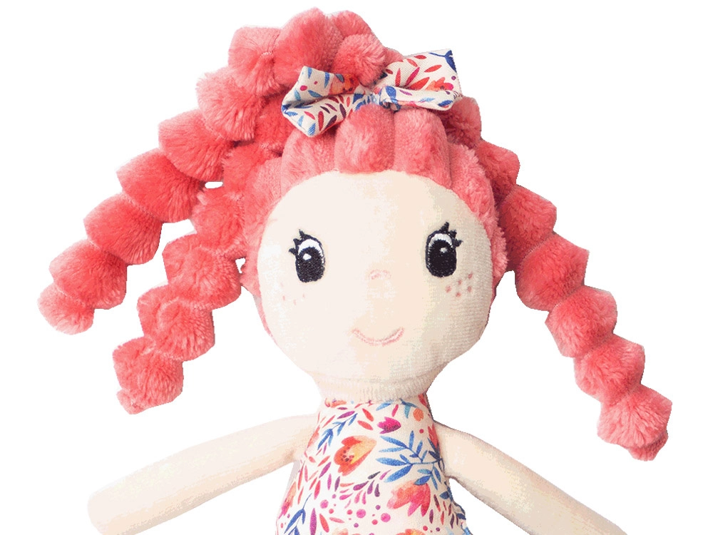 Ružičaste kovrče, mašnica i cvjetna haljinica daju lutki razigran izgled i potiču maštu tijekom igre.